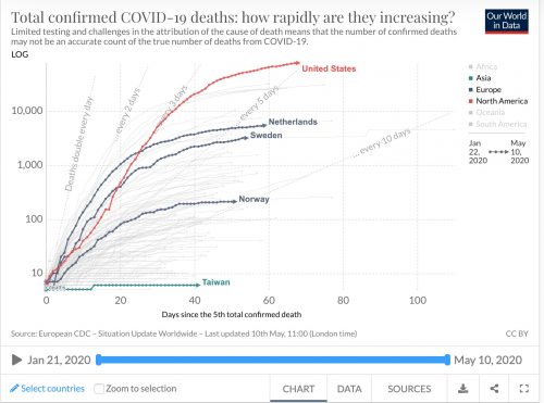 I think there is a big problem here when you are looking only at the deaths. A huge amount of the deaths in a lot of places are nursing homes and health care facilities. But that misses a huge swath of people who are getting sick – having to go to ER – we’re talking weeks turning into months. 50 days. Six weeks. Ongoing. My friend’s wife is now in intensive care. My friend just posted on Facebook how hard it was saying goodbye not knowing when or if she’ll be back. That’s the part of this story that is not being told and not showing up in the death stats. And btw, the economy in Sweden is no better than their neighbors.
