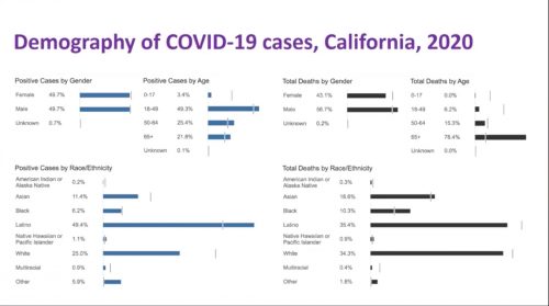 The bottom chart is a slide from the UCSF Dept. of Medicine Grand Rounds this week. It points out the significant disparities among ethnic groups on deaths.