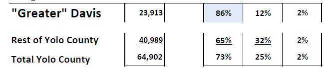 A grateful shout out to my part of town, OED which along with central Davis and downtown were the bluest of blue at 91%, and to Alan for compiling the results for us.