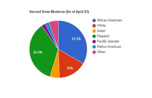 - Out of 225 total second doses of Moderna, 75 were African American, 36 were White, 12 were Asian, 80 were Hispanic, 5 were Pacific Islander, 5 were Native American, and 12 identified as Other