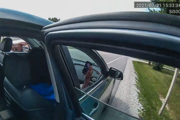 The video continued to show the searching officer hand the plastic bag to another officer, who then returned to the vehicle and appeared to throw the bag on the back seat.