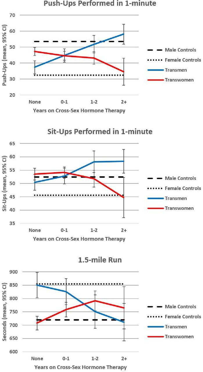 You’re not really answering my question here. I asked why the difference would go from 9 percent after year one to 12 percent in year two. And now that I look at the data – I see what is going on. If you look at push-ups and sit-ups you see performance goes down and by the time you get to two years it is equality. In the 1.5 mile run, for some strange reason that’s not happening. Performance goes down for transwomen up to 1-2 years. It goes uniformly up for transmen (women transitioning to men). But for some reason from year one to year two, in the run and in the run only performance actually improves. Which to me is an anomalous finding and suggests the need for more research. I’m done because you are going to just argue your points without trying to make sense of the data. Maybe Richard will engage a little since he understands data better.
