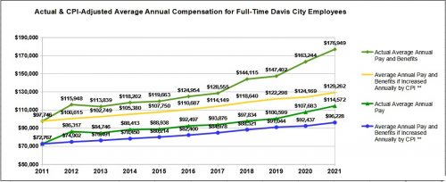 In January of 2022, the author published an analysis of annual compensation and raises given to City of Davis employees from 2011 through 2020 and compared them to a government-calculated inflation rate (the Bay Area Urban Wage Earners & Clerical Workers Consumer Price Index) to determine the impacts these raises had on the City budget (see https://davisvanguard.org/2022/01/effects-of-excessive-increases-in-city-of-davis-employee-compensation-from-2011-to-2020-on-the-citys-ongoing-budget-crisis/). That article only looked at compensation data through calendar year 2020. This article updates those disclosures through the calendar year ending 2021.
