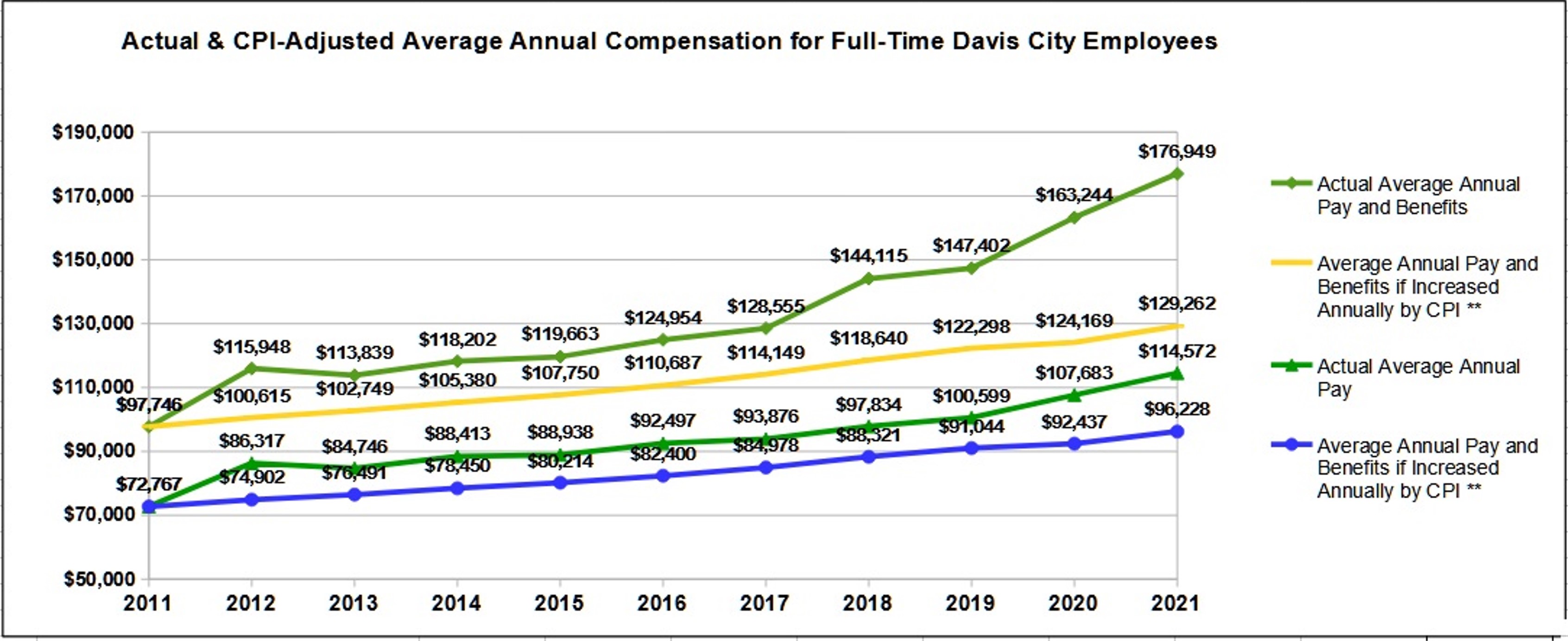 For example, the actual average annual total compensation (Pay and Benefits) paid to all FT City of Davis employees in 2020 was $176,949. If annual increases in total compensation were otherwise held to the annual Bay Area CPI Index, the average annual total compensation would instead be $129,262.