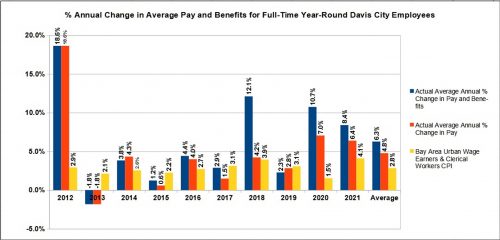 To summarize the above information, the average annual increase in the Bay Area CPI from 2011 through 2021 as reported for Bay Area Urban Wage Earners & Clerical Workers by the US Bureau of Labor Statistics is 2.8%. The actual annual average increase in Pay and Benefits for City of Davis FT employees is 6.3% and the actual annual average increase in Pay for FT City employees is 4.8%.