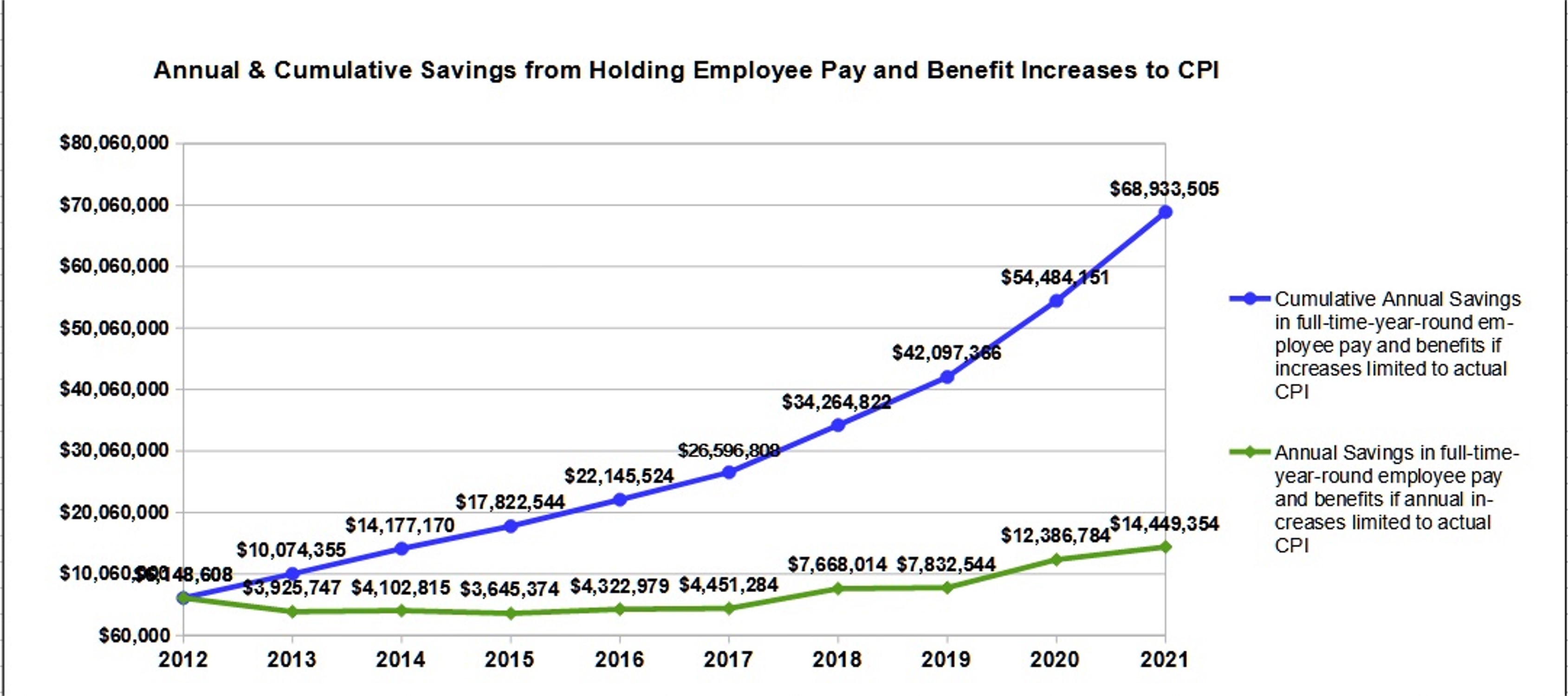 On a cumulative basis, the City has paid in excess of almost $69 Million more to FT employees in Pay and Benefits from 2012 through 2021 compared to if annual total compensation increases otherwise been held to increases based on the Bay Area CPI.