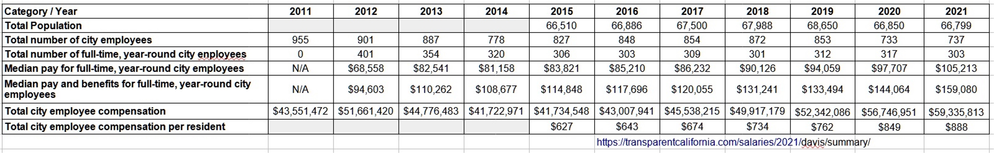 The following table shows summary statistics of City of Davis employee compensation as reported by Transparent California (www.transparentcalifornia.org).