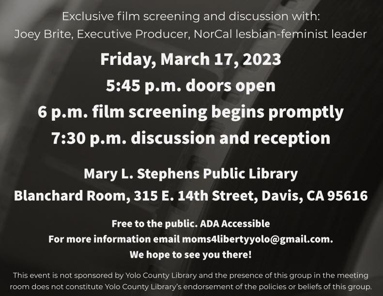 The public is invited to a film screening of “Affirmation Generation” on Friday, March 17th at the Davis branch public library, Blanchard community room at 315 E. 14th Street in Davis. The doors will open at 5:45pm for the 6:00pm showing, and a reception and open discussion will follow the screening.