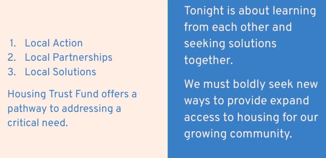 The housing trust fund, which we’re going to be discussing in detail tonight, is one of those examples of public investment, a reflection of our values as a community being used as a lever away from for-profit only development. I’m not saying for-profit only development will go away. No, no. It’s expanding the marketplace to include nonprofit and public oriented development. So I’m very excited to learn from my colleagues on the right of me here and from all of you in the room on how we can make this shift towards funding our housing trust fund in a way that gives us another path forward. And with that, I will leave you. Thank you so much for the time.