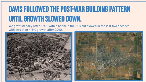 minutes that I have, so I’m going to be talking fast, so please excuse me, is instead dig into that. No. We’re going to talk a little bit about the history of our growth in Davis, where we are right now in terms of our housing stock and access to housing, and then transition as Josh just set us up perfectly for to thinking ahead towards how we shift the paradigm for how we add housing and think about housing in the city and in the region. So with that, if you could please
