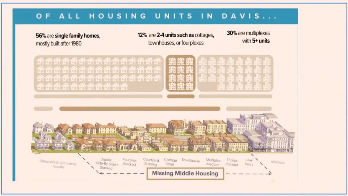 Of all the housing units in Davis, the top reflects Davis, 56% are single family homes and most of them were built after 1980. Alright, on the right hand side there you see that 30% are multiplexes. The apartment buildings that are of higher density within our city, 12% represent condos, townhomes, et cetera. I better hurry up my time’s running out that bottom side.
