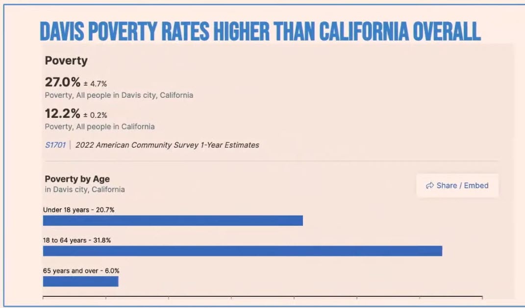 We think of ourselves as an affluent community, and it’s true there is significant affluence here in Davis. However, that top number might surprise you based on the census data. We are at 27% poverty, you might say in your mind quickly. Well, that’s because of students. Students are focused on their studies, they’re not earning an income. It’s bringing that number up. However, when you look at the number at the top there, and perhaps for those of you in the back that can’t read it, it shows that for children under 18 years old, we’re at 20% poverty. The average poverty percentage for the state of California is 12.2%. Are we as affluent as we say we are? Please if you could go to the next slide.