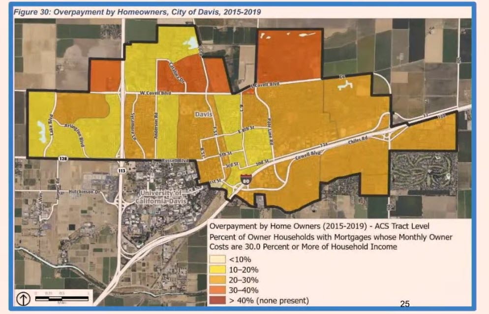 Here’s more evidence of that. This is from our housing element. Thank you city of Davis for completing our housing element. This graphic shows what overpayment by homeowners looks like across the neighborhoods in Davis. If you live in Davis, take a moment and find your address on the screen. Now, if you look at it, this means the federal definition of being overburdened in your house payments is that you’re paying 30% or more. That’s the threshold, 30%. What this graphic indicates is that there is not a single neighborhood in Davis where people are not struggling to pay their mortgage varying degrees. Yes, some people are doing well, yes, but with every single neighborhood we have struggle. Please go to the next slide. 55% of our city are renters. Of our renters. The situation is far more dire. The scale here has changed. Where the yellow has moved to 20 to 40%, the previous slide was 10%.