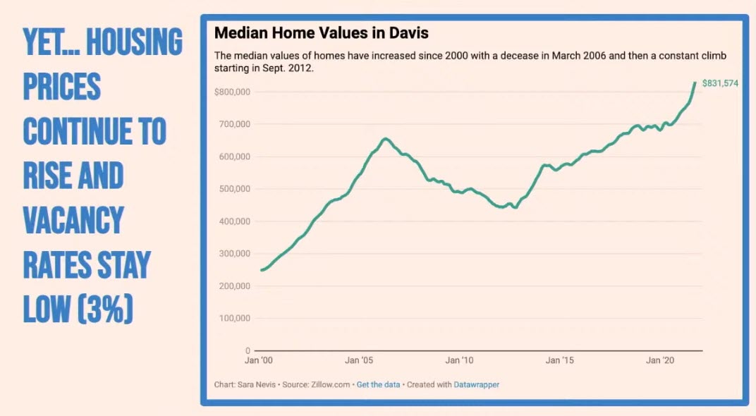 Next one yet, housing prices continue to rise and vacancy rates stay low. There is a combination effect here. Part of the American dream subdivision planning model that Davis is a part of also includes the fact that we rely on land value and house appreciation as part of our fortune. Having an address that you own, having an address where you rent dictates your fortunes in different ways, and I’m using the term fortune in two different meanings.