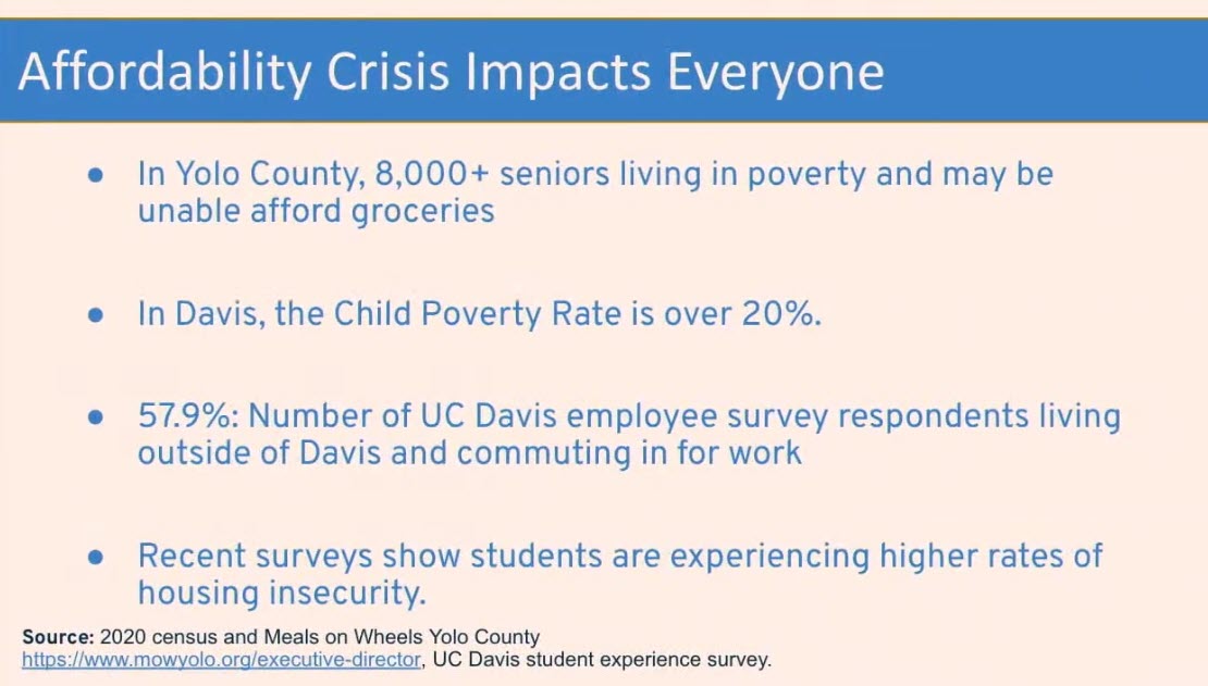 That means that if you were to choose any street in Davis, close your eyes, open them again and pick an address. Chances are the people that you are looking at, the kitchen table that they’re sitting at is one that’s struggling to pay for food because they are overburdened in their housing payments. And I’ll say this point more clearly, we know it’s more than 30% based on this graphic. We don’t know if it’s 75%, we don’t know if it’s 50%, but we know it’s too high.