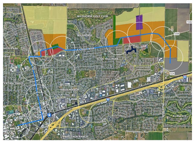 3) The remainder of the land above these higher density zones Im talking about today… there will probably be single family in the mix up there… someday. But again, I think that is fodder for the general plan process. I have left those zones out because they are not in range of the transit line I have envisioned, and single family home = car-served home, and I don’t know if higher density works without that transit line. I actually think it could- but because of the advent of the e-bike where davis might suddenly actually be as bike able as it is touted to be because with electric bikes you CAN bike around town in summer without arriving drenched in sweat…